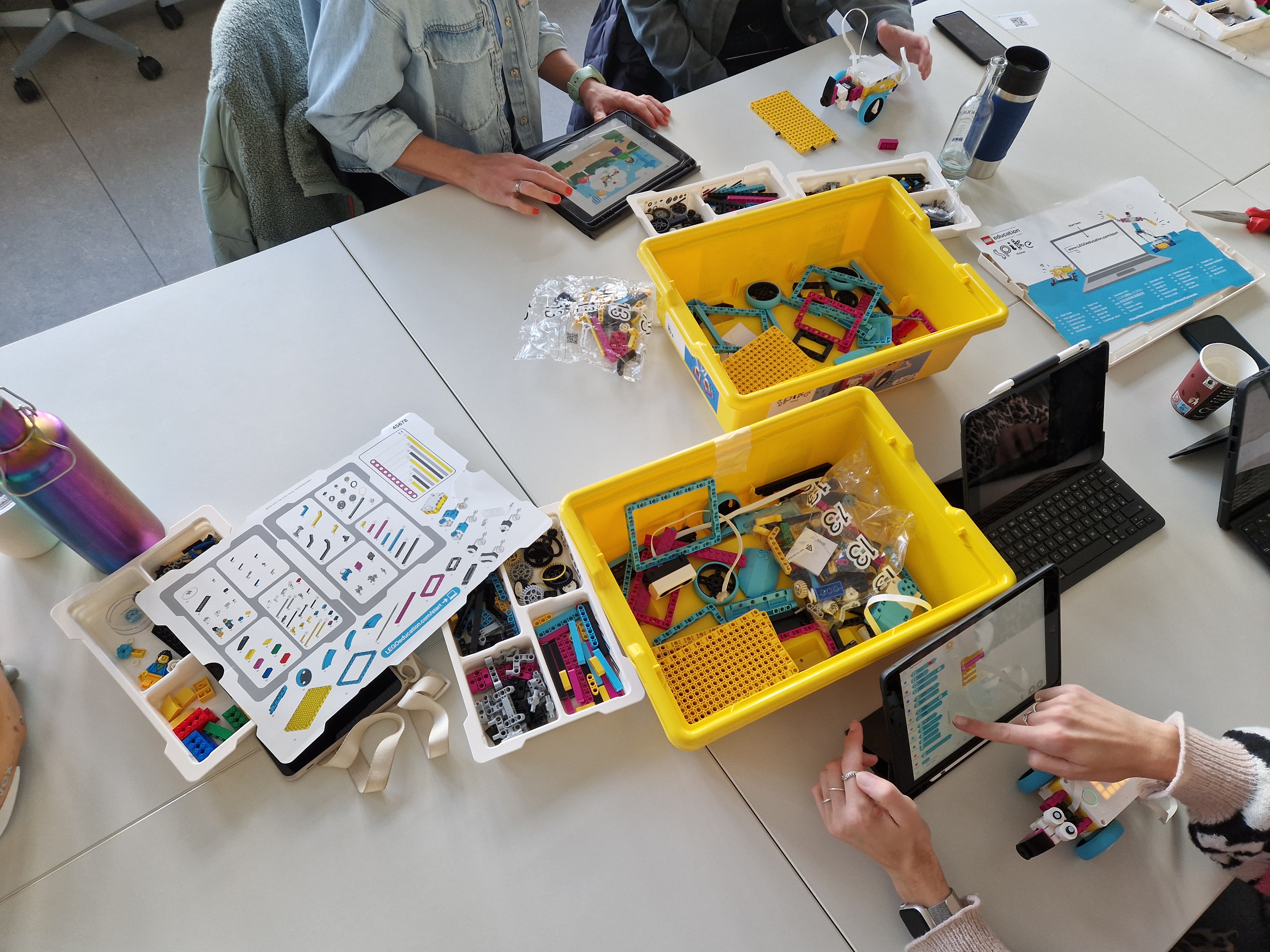 Einige Personen sitzen am Tisch und bauen mit Lego