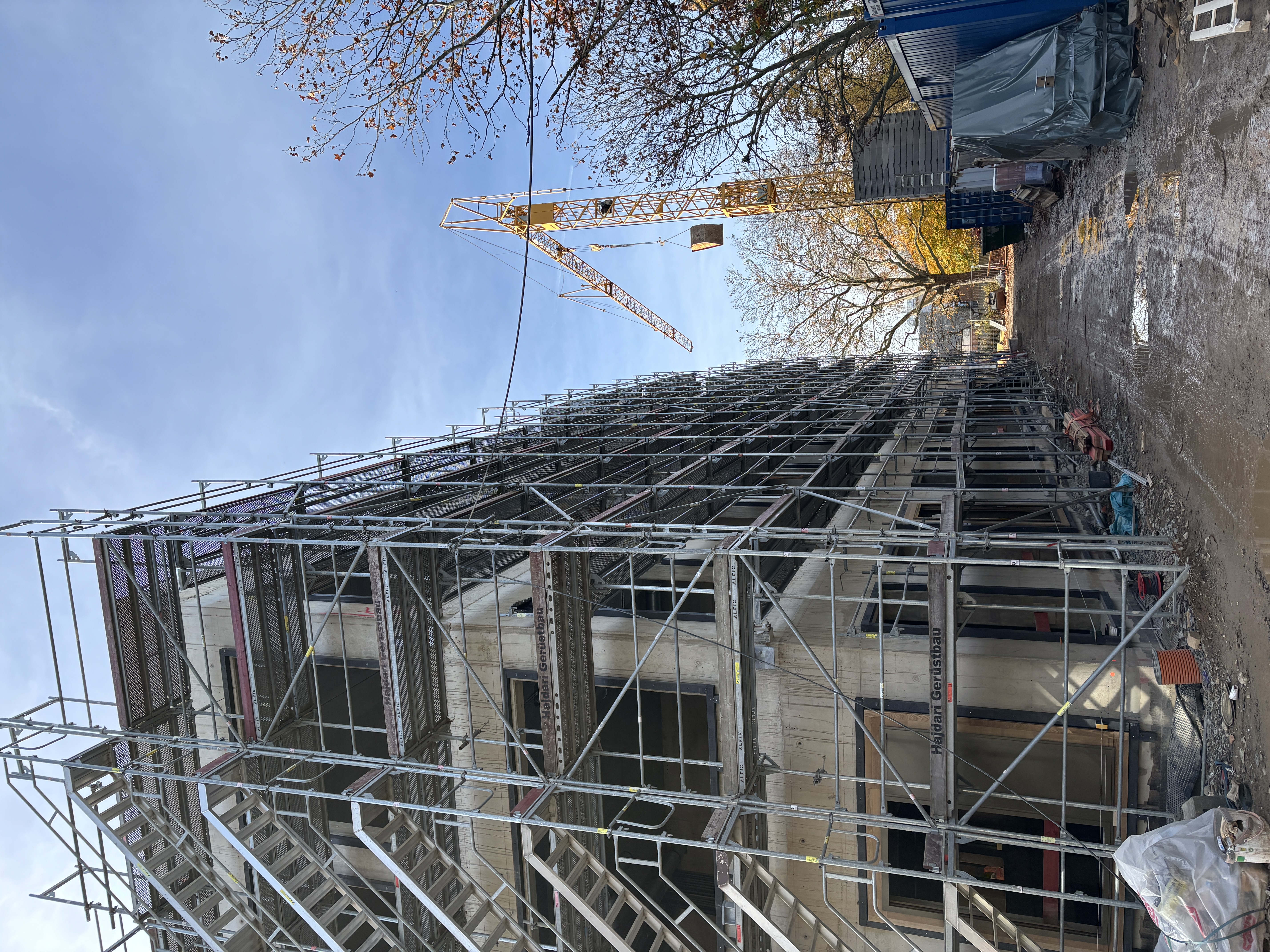Dazu gehören Arbeiten, die das Gebäude wetterfest machen: Fenster und Türen werden montiert, die Dachflächen abgedichtet und für die spätere Begrünung vorbereitet, die vorgehängte Fassade wird errichtet. Wände werden verputzt, die Belüftungsanlage montiert und die Elektroinstallation eingerichtet.