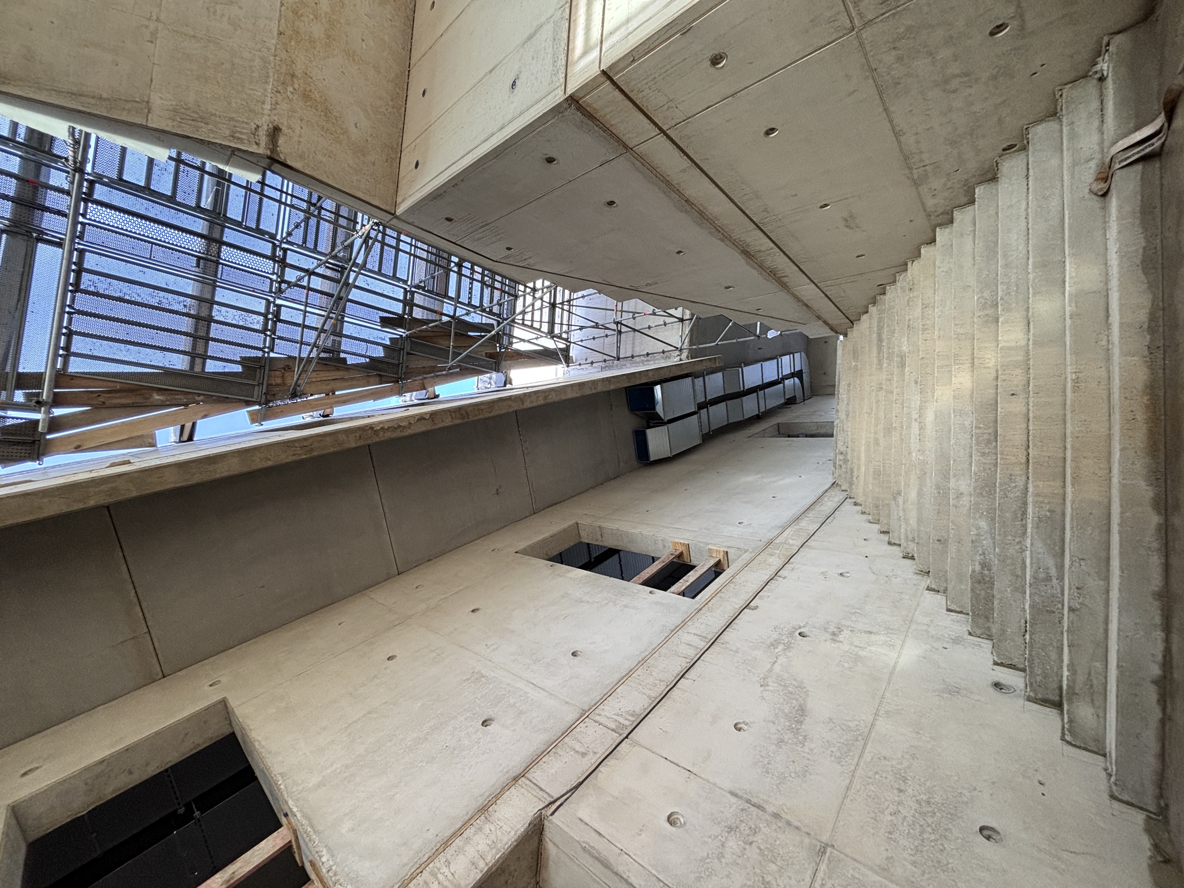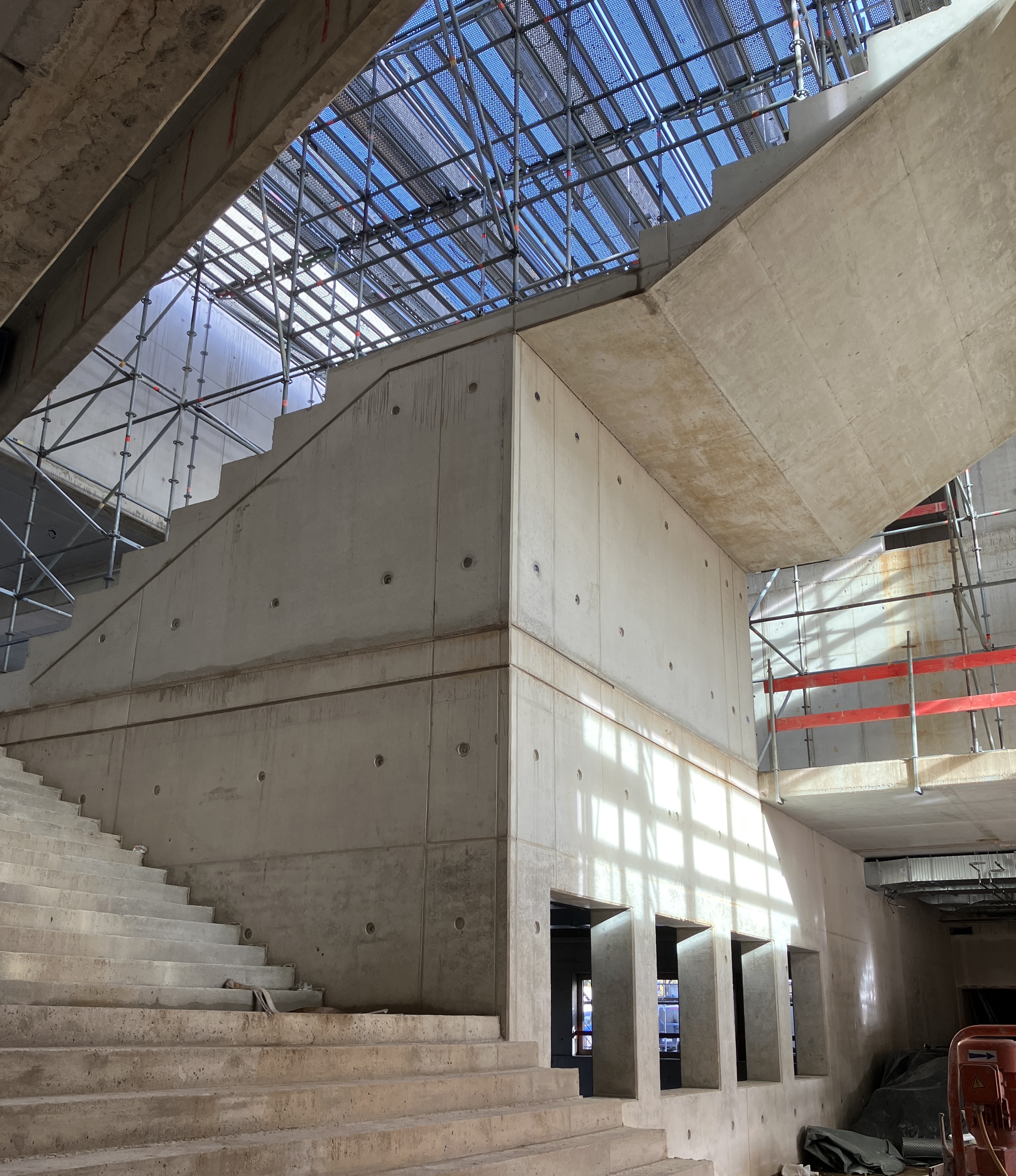 Der Rohbau ist fertig: Sämtliche Außenwände stehen, die Zwischendecken sind eingezogen und das imposante zentrale Treppenhaus wurde gegossen. Als letzter Schritt wurde die Montage der Holzbinder und Glaspaneele, die das luftige Dach über dem zentralen Foyer- und Treppenhaus – auch „Marktplatz“ genannt – bilden, abgeschlossen, so dass nun auch der bereits begonnene Innenausbau weiter vorangetrieben werden kann.
