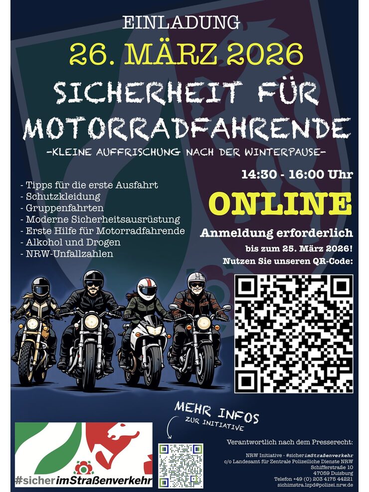 Mit dem Frühling beginnt für viele Motorradfahrende endlich wieder die Saison – doch nach der Winterpause ist besondere Vorsicht geboten. Genau hier setzt die NRW-Initiative #sicherimStraßenverkehr an und lädt zu einer informativen Online-Veranstaltung ein.